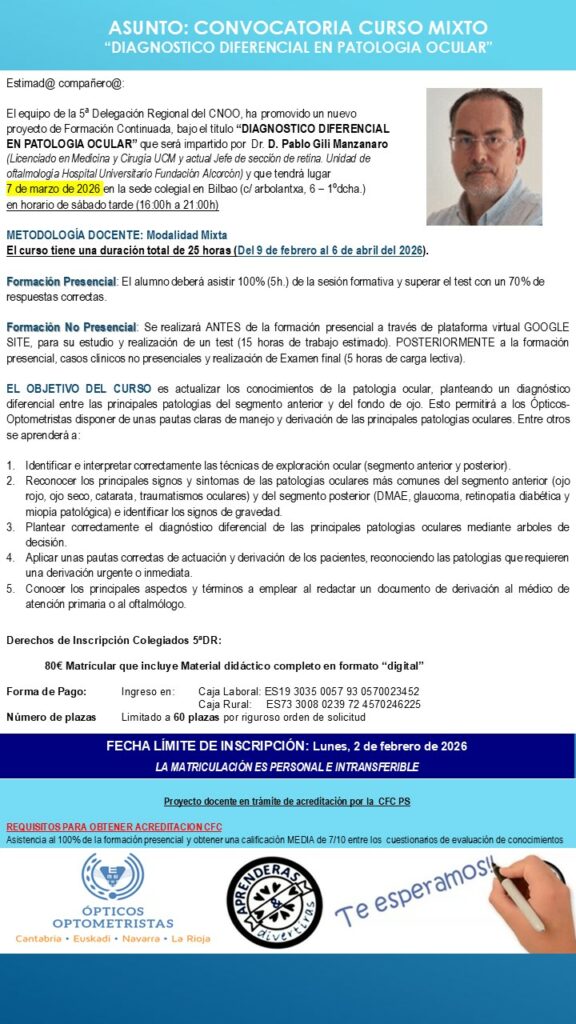 Os presentamos un nuevo e interesante proyecto de Formación Continuada, bajo el título título “DIAGNOSTICO DIFERENCIAL EN PATOLOGIA OCULAR” que será impartido por Dr. D. Pablo Gili Manzanaro (Licenciado en Medicina y Cirugía UCM y actual Jefe de sección de retina. Unidad de oftalmología Hospital Universitario Fundación Alcorcón) y que tendrá lugar 7 de marzo de 2026 en la sede colegial en Bilbao (c/ arbolantxa, 6 – 1ºdcha.) en horario de sábado tarde (16:00h a 21:00h)