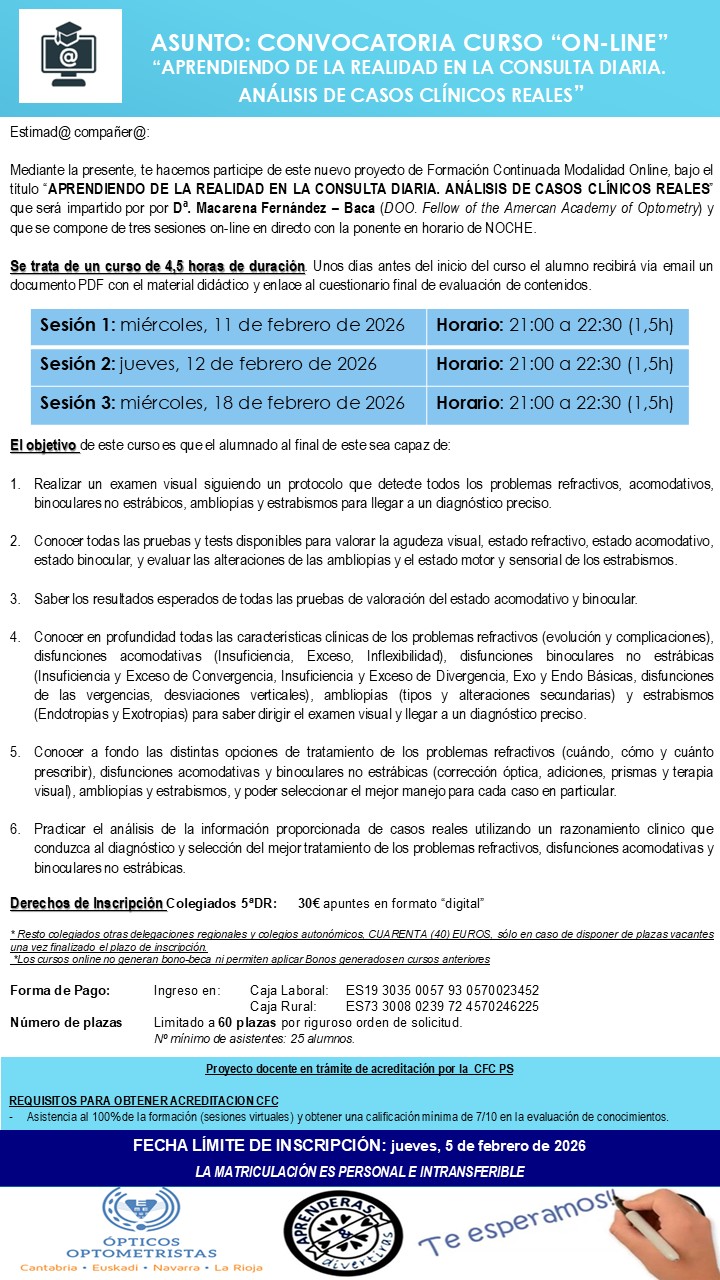 Nuevo proyecto de Formación Continuada Modalidad Online, bajo el título “APRENDIENDO DE LA REALIDAD EN LA CONSULTA DIARIA. ANÁLISIS DE CASOS CLÍNICOS REALES” que será impartido por por Dª. Macarena Fernández – Baca (DOO. Fellow of the Amercan Academy of Optometry) y que se compone de tres sesiones on-line en directo con la ponente en horario de NOCHE.