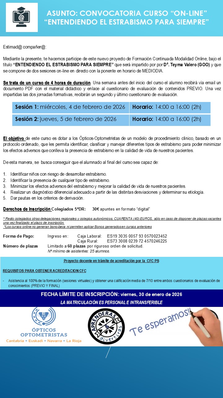Nuevo proyecto de Formación Continuada Modalidad Online, , bajo el título “ENTENDIENDO EL ESTRABISMO PARA SIEMPRE” que será impartido por por Dª. Teyma Valero (GOO) y que se compone de dos sesiones on-line en directo con la ponente en horario de MEDIODIA.